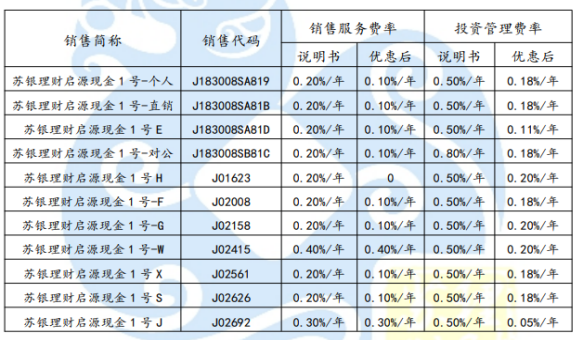 ? ?管理人自 2023 年 9 月 29 日起,對(duì)“蘇銀理財(cái)啟源融匯現(xiàn)金 1 號(hào)”理財(cái)產(chǎn)品的銷售服務(wù)費(fèi)、投資管理費(fèi)給予優(yōu)惠,具體安排如下: